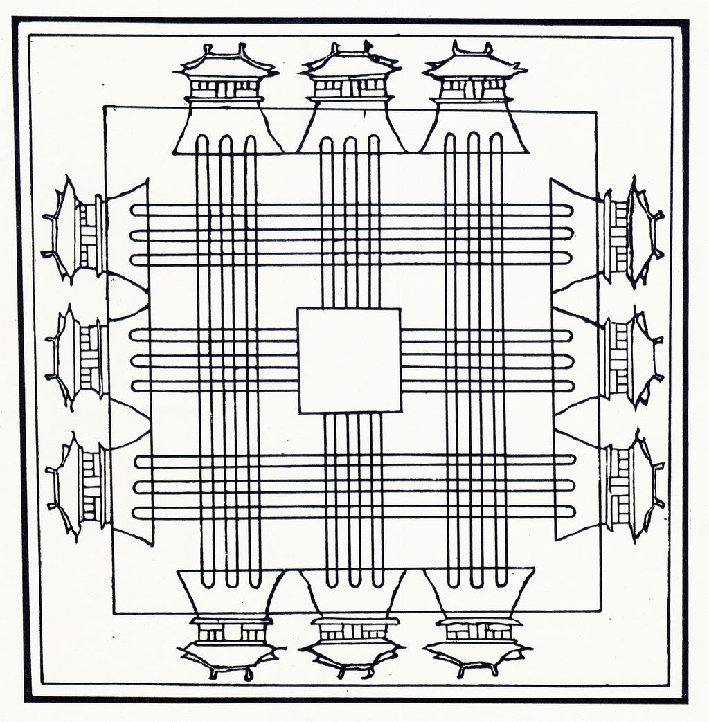 582年、隋の初代皇帝文帝は、北から南へと下る丘陵状の台地を選ぶと、この時代の統治理念「平和・安定」を、「秩序の確保」により実現するべく、周到に都市計画をまとめ取り組んだ。すなわち、長安は計画都市として、太陽の運行や北極星の位置を見極め、中国古来の伝統思想に従い(周王城図、図6)、南北方向に都市の中心軸を取り、都の北に宮城を配すと、その下に東西に宗廟(祖先の霊廟)と社稷壇(土地や穀物の神を祀る祭壇)を置き、市街を左右対称に碁盤目状に規則正しく割り、道路や街区を整えた。完成は、唐の三代皇帝の時代に入ってしまうが、「長しえに安らかなり」と書く長安は、平和が末永く続く、「永遠の都」として建設された。