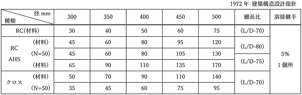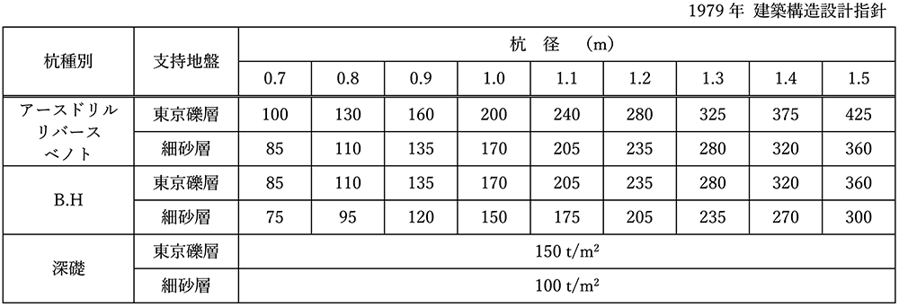建築物基礎および基礎杭の旧来の耐震設計方法については、上部構造と異なりその実態が十分には把握されていない。建物・基礎杭の設計に係る基規準の変遷を表①中央欄に、『建築構造設計指針』の変遷を表①右欄にまとめる。関東大震災の翌年である大正13(1924)年に市街地建築物法に建物の設計震度が規定され、上部構造の耐震設計はこの時期に開始されたといえる。地中深く打ち込まれた杭に水平力が作用する場合の応力計算式(changの式)が昭和12(1937)年に米国土木学会で発表され、地震力に対する杭の設計も旧くから行われていた可能性はあるものの、その実態は把握されていない。昭和8(1933)年には『鉄筋コンクリート構造(RC)計算規準』が、昭和25(1950)年には建築基準法が、昭和35(1960)年には『建築基礎構造設計規準』(以下、基礎規準)が制定され、建物および基礎の設計方法はこの時期に確立されたといえる。杭については昭和45(1970)年版基礎規準において許容支持力が極限支持力の1/3と規定されており、昭和49(1974)年版基礎規準において杭の水平力に対する検討方法が記述されている。一方、東京都では昭和41(1966)年に『建築構造設計指針』が発刊され、この指針は建築技術の進歩に応じた都市の立体化と高層化の傾向に対応し、構造耐力上の安全性を確保するためとしている。昭和47(1972)年改定2版では、高さ20m超の建物の柱帯筋に13φ@100を求め、高さ31m超の部分の設計震度を図❷に示すように1.5倍に割増すなど、中高層建物の耐震性能の確保が図られた。また杭基礎については、N値50以上の良好な地盤に支持させることを条件に、既製コンクリートパイルについて表②の標準支持力を示すなど、杭支持力の確保に寄与してきた。さらに、昭和54(1979)年改訂第3版では、杭の支持力算定において液状化の恐れがある地盤の周辺摩擦力をみないこと、場所打ち杭では表③に示す値を長期支持力の上限とし、杭の先端を良質な地盤に1.0mかつ杭径以上貫入することを求めている。