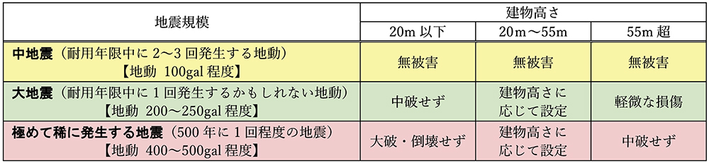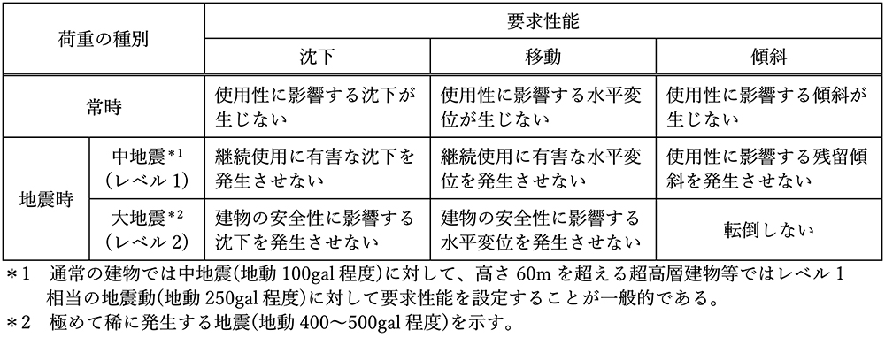 昭和43(1968)年十勝沖地震における建物の被災を踏まえ、昭和52(1977)年には既存建築物の耐震診断基準が日本建築防災協会から発刊され、昭和56(1981)年には建築基準法が新耐震基準に改正された。これ以降の建物には表④、表⑤に示すように震度5弱の地震動に対し目標性能を小破せずとし、クライテリアを短期許容応力状態、震度6強~7の地震動に対して目標性能を大破・崩壊せずとし、クライテリアを保有水平耐力以下とする2段階の地震に対する耐震設計が求められることとなった。しかしながら、建物基礎についての耐震設計上の法整備は上部構造に比較して遅く、昭和59(1984)年に『地震力に対する建築物基礎の設計指針』、平成13(2001)年に国土交通省告示第1113号において地盤の許容応力度および杭基礎の許容応力度が定められたが、2次設計に対するクライテリアは定められていない。