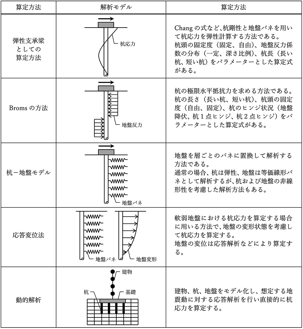 地震時における杭応力の算定方法は表⑫に示すさまざまな方法がある。弾性支承梁としての算定方法(Changの式)は最も旧くから用いられている方法で、杭剛性と地盤バネから求める方法である。Bromsの方法は杭の極限水平抵抗を求める方法である。杭・地盤モデルは地盤を層ごとのバネに置換して解析する方法である。応答変位法は軟弱地盤における杭応力を算定する場合に用いる。動的解析では建物、杭、地盤をモデル化し、地震応答解析により直接的に杭応力を求めることができる。いずれの解析においても土のモデル化により計算結果が支配され、土の性状は地震時の地中に生じる歪みに応じて大きく変化するため解析は可能であるが、計算結果の妥当の検証は十分に行われているとはいえない。したがって、現状においては杭の設計は支持力の確保を最優先とし、地震時の横抵抗は数値計算に頼ることなく強度・靭性に優れた杭種を選定することが重要である。