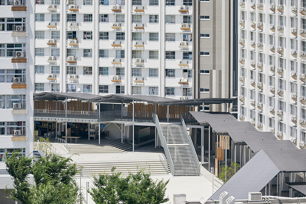 こちらは築50年の団地をリニューアルするプロジェクトの一部、アーケード屋根でパーフェクトルーフをご採用いただきました。このアーケードは後付けとは思えないほど、建物に馴染むようにデザインされており、今では町の人びとが集まる半屋外空間として活用されています。後付けとなると屋根に響く雨音も不安もありますが、パーフェクトルーフは防音性も特徴のひとつ。屋根形状に併せてパーフェクトルーフの持つ性質を最大限に活かされた屋根ではないでしょうか。