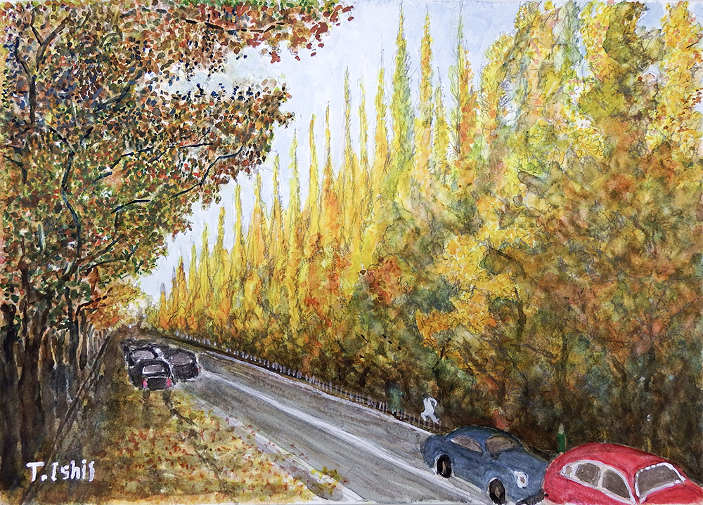この絵は晩秋の夕方の景観を対向車線で分けて描きました。夕日が指している車線側のイチョウと車はまだ明るい光景ですが、一方別車線側は夕日が落ち暗闇かかったイチョウとテールランプの車で明暗を映し出しました。