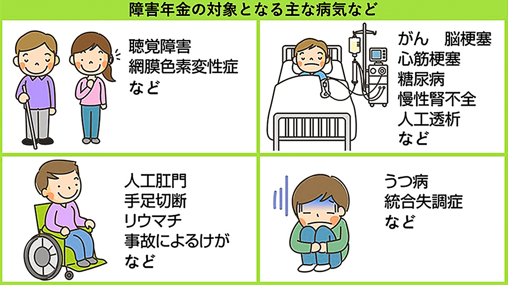 障害年金の対象となる病気は、眼や耳、手足の障害だけではありません。長期療養が必要ながん心疾患、呼吸器疾患などの内部疾患も対象となります。精神の障害によって、仕事や日常生活が困難な状態になったときなども含まれます。