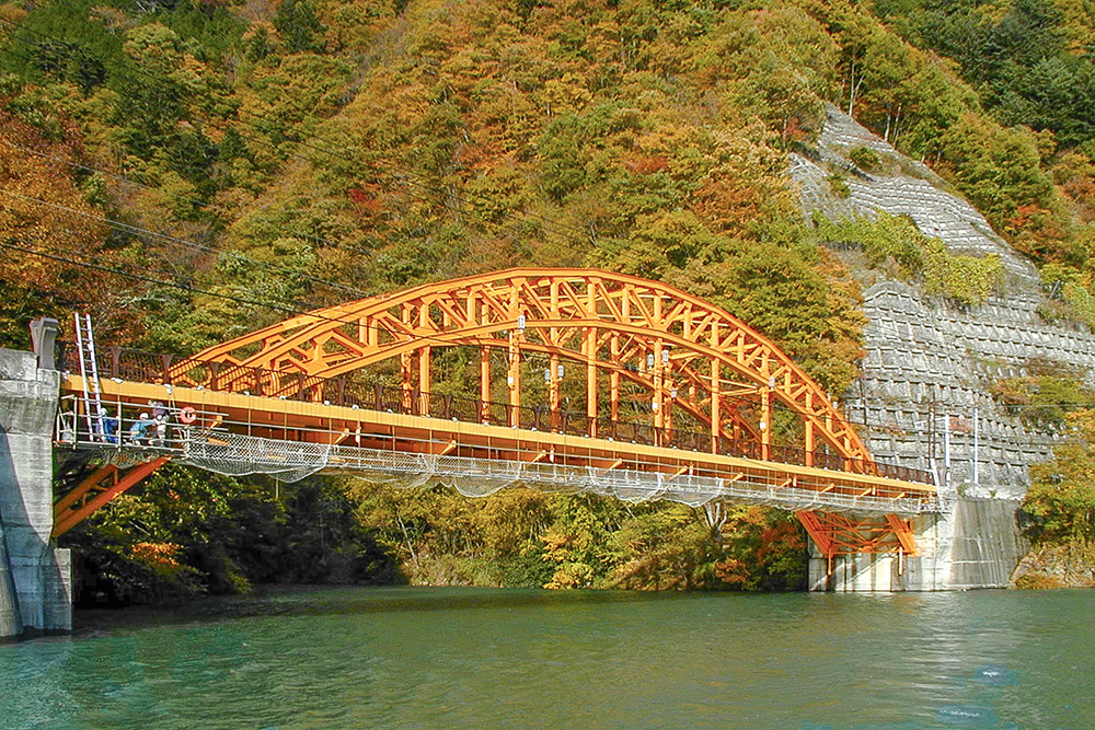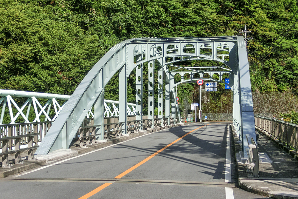 アーチが鋼製のトラス構造でつくられた中路式ブレストリブアーチ橋。一見タイドアーチ橋に見えるが、支承はアーチ軸線の延長上に設置され、強固な岩盤でアーチ反力をとっている。中路式のアーチ橋では建設時に国内最長を誇った。恐竜を彷彿させるような重厚なフォルムが特徴。橋門構の紅葉の飾りは、平成初めの修景事業で設置されたもの。