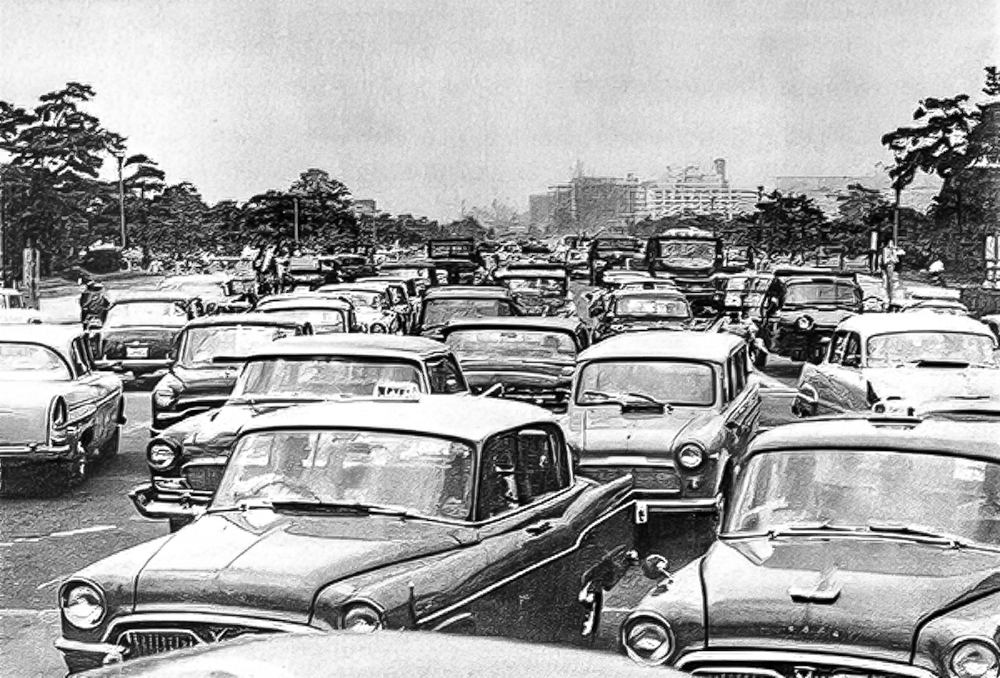 1960年代に入ると経済活動が活発化、「もはや戦後ではない。」という雰囲気となり、建築物の中高層化をめざし鉄筋コンクリート造や鉄骨造の建築物が普及していく。こうして地価が高騰、都市は広い範囲にわたり、高密度化の傾向が出てくる。これまでわが国の容積率規制は、空地地区として都市周辺部の住宅地を対象に実施され、都市の中心部では、建蔽率と絶対高さ制限の組み合わせで間接的に行われてきた。そのため都心部では頭を抑えられた建築物が敷地一杯に広がり地下深く伸びていった。また階数を稼ぐため階高を低く抑えるようにもなっていた。結果、地階からの避難が危惧されたり、居室において日照や採光等の確保が難しくなったり、換気など室内衛生環境の面から不健全な状況を呈するようになってきた。さらに、商業地では進展するモータリゼーションに対応、自動車駐車場等を敷地内に確保することが難しく、道路上に置かれるようになったため交通渋滞が起こり(写真❶)、排気ガスで大気汚染が深刻化するようになった。