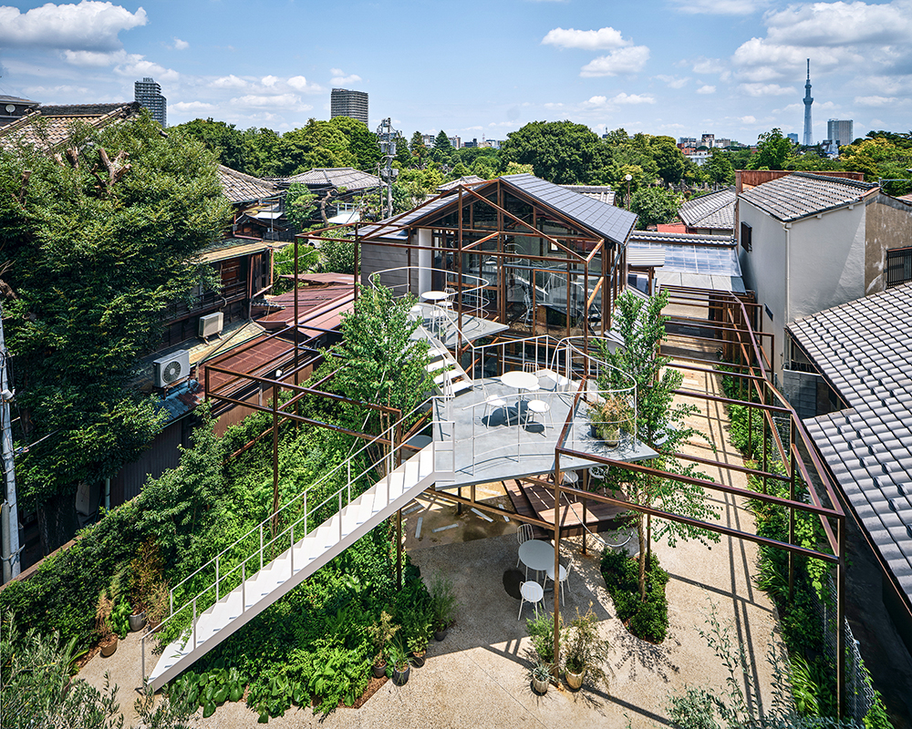 審査はまず設計者の事務所から始まった。事務所は、上野にある通りに面した古家。道に面したシャッターを全開し、そのまま事務所として使っている。クライアントは事務所の前を通りかかりこの仕事を依頼して来たという。プロジェクトは事務所から歩いて僅か数分のところ、この距離感がこのプロジェクトを成功させた大きな要因のひとつであろう。このプロジェクトは登録有形文化財に指定された花重を保存しながら、地域の人が立ち寄れるカフェとして再生したもの。敷地の奥半分の建屋を壊し、庭として再生しつつスチールのフレームを増築している。フレームは、将来的に変化し続けるものとして存在するために、無垢のスチールを精緻な継ぎ手によってボルトで接合してできている。果たしてそこまでお金をかける必要があったのだろうかと思ってしまうほど、精密機械の精度で出来上がっている。恐らくその緊張感が、古家の持つ歴史に共鳴し、このプロジェクトの魅力を高めている。フレームにはテラスが設えられ、外部でお茶を楽しむのに適した影を提供している。歴史を刻んだ古家と精緻なフレームと緑が相まってこのプロジェクトの価値を高めている。古家は、ジャッキアップして基礎から丁寧に再生され、未来へと繋がるものになっている。実はこのプロジェクトでより手間暇がかかっているのは、増築部より古家の方であろう。そこにかけられた時間がこの建築の価値として積み上げられ魅力となっているのを感じた。(手塚 由比)