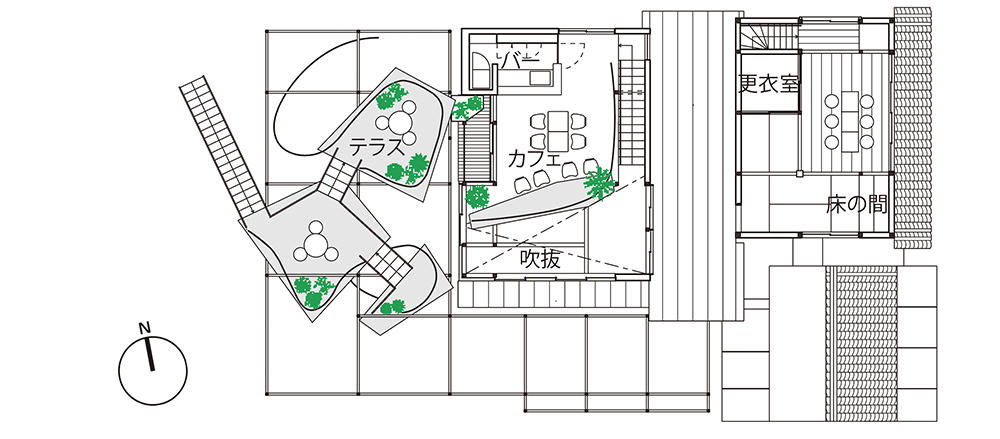 新たに加えるエレメントは全体を横断するように配置することで、新旧や屋内外、人と植物を連鎖的につなぐことを考えた。骨格としての「律」が空間のベースにあることで、エレメントやアクティビティが変化していくことを受容し、変化し続ける生きた建築となることを目指した。(高野 洋平、森田 祥子)