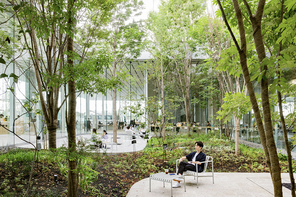- 大庇の下のひとつながりの空間「JOSAI HUB」。ラウンジより東方向を見る。