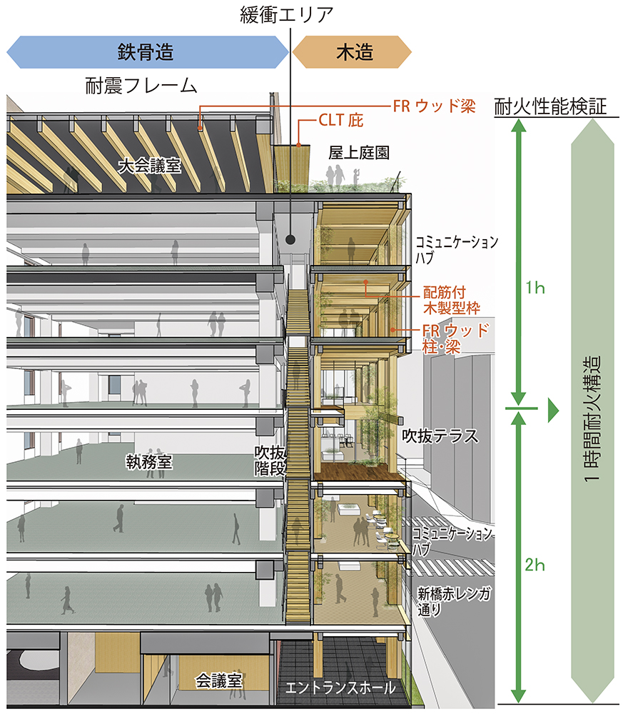 大正12(1923)年に発生した関東大震災直後に、復興建築資材として合板供給のため起業した本社ビルであり、創業100周年を機に、創業の地で本社ビルを建設する記念プロジェクトである。新橋発祥の老舗企業の願いとして、環境に配慮した持続可能社会と良質な都市環境形成に貢献する建築の在り方が求められ、まちなみと一体感のある木架構の佇まいを構想し、純木質耐火集成材「FRウッド」を多層型建築の主要構造部に初めて適用した。