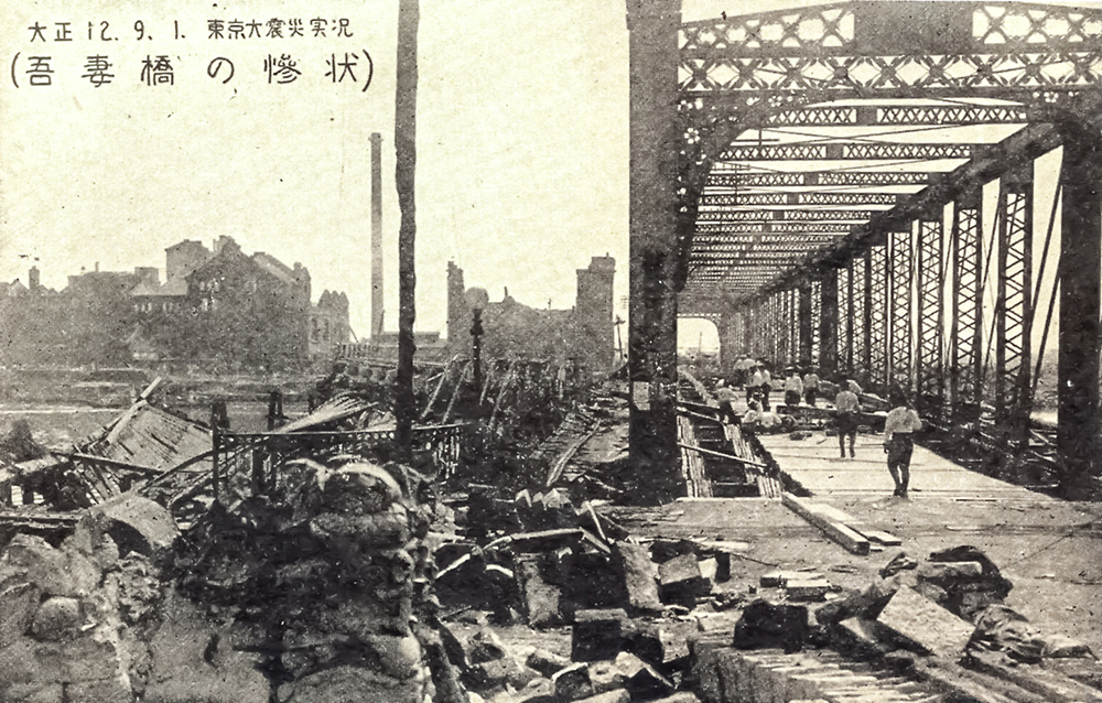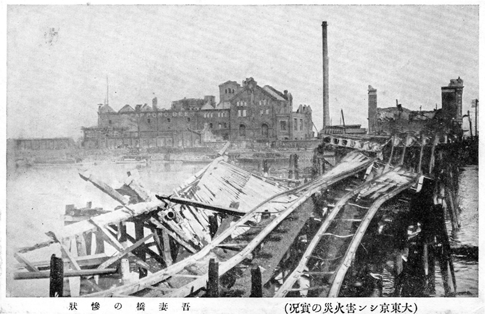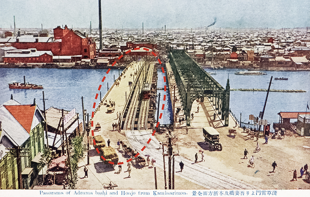 「吾妻橋」は市電の通行を可能にするため、耐荷力アップと拡幅を目的に、1923(大正12)年3月から架け替え工事に着手した。トラス橋の隣に、工事中に交通を迂回するための幅員7.2mの道路橋と市電橋のふたつの木造の仮橋が8月31日に完成。9月1日の朝に交通を迂回させた直後に地震に見舞われた。❸は震災後に復旧した吾妻橋を撮った絵葉書であるが、点線で囲んだ箇所が仮橋である。震災当日は、これと同様な状況にあった。これらの仮橋は周囲からの火炎で焼失した。❶の絵葉書に写された瓦礫は焼け落ちた仮橋で、ひしゃげたものは仮橋上に設置されていた市電のレールである。またトラス橋も床版は木造だったため、延焼して通行不能に陥った。