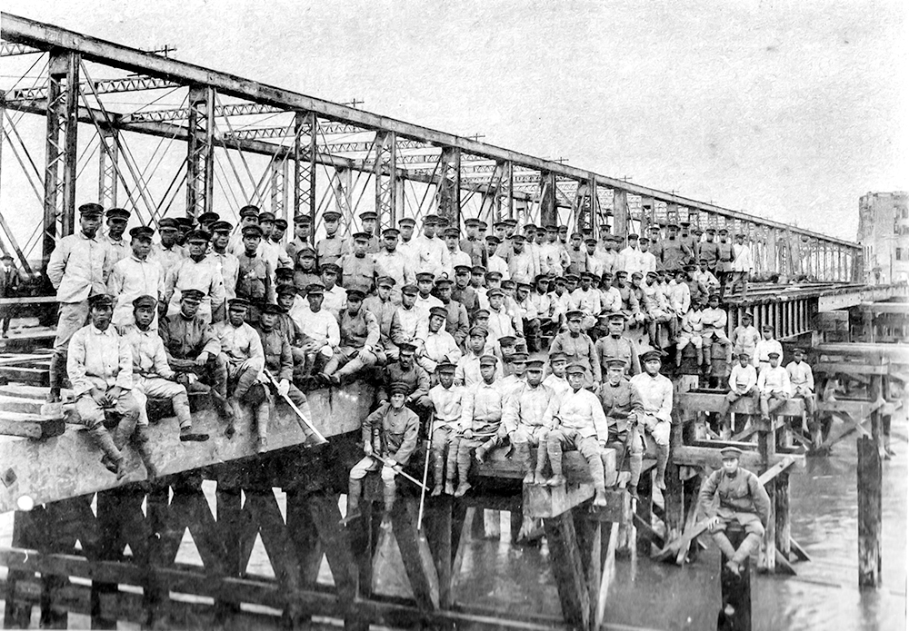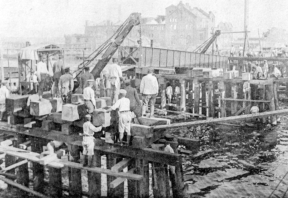 ❹鉄道連隊による市電橋の復旧工事。『吾妻電車橋架設 記念写真帖』より(紅林所蔵)