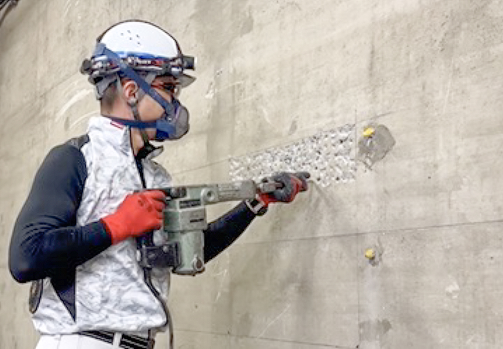 近年、持続可能な開発目標(SDGs)やカーボンニュートラル実現に向けた取り組みの一環として、建築分野では建築物の長寿命化や建築ストックの有効活用が重要なテーマとなっている。建築ストックを有効活用するためには、耐震改修や増改築、大規模修繕や大規模な模様替え等を伴うことから、既存部材と新設部材を接合する工事が多く発生する。コンクリート同士の接合には、相互のコンクリートの一体性を高めるために、従来から「目荒らし」が多く用いられている。目荒らしの方法は、電動ピックに斫り用のドリルビットを装着して行うチッピングと呼ばれる目荒らし(以下、チッピング工法)が多く用いられる。チッピング工法の施工状況を写真❶に示す。このチッピング工法は、打撃によりコンクリート表面に凹凸を形成させるため、騒音や振動、粉塵を伴うことが多く、さらに打撃による既存部材へのひび割れの増長や損傷等が懸念される。チッピング工法は、各基規準で構造規定として面積や深さが記載されているが、この面積や深さ等による形状は、それぞれの各基規準で異なっている。この理由は、①チッピング工法における面積の測定方法が確立されていないこと、②形状が複雑であること、③施工者の技量により深さや形状が異なること、などが考えられる。これらのことから、チッピング工法施工時の面積や形状の管理は非常に困難であり、期待する構造性能を満足するような品質を確保することも難しいと考えられる。