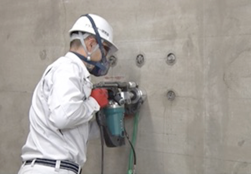 これらの背景により、著者らはチッピング工法と比較して低騒音・低振動・低粉塵で施工が可能な目荒らしとして「ブラストキー」の開発を進めてきた。ブラストキーは、直径52mm、深さ6mm程度(直径の約1/10)の円柱状のシアキーを既存躯体と補強部材の接合面に配置する工法である。ブラストキー工法の施工状況を写真❷に示す。施工は湿式コアドリルで穿孔するため、打撃を行わずに低騒音・低振動・低粉塵での施工が可能となり、固体伝搬音を低減することができる。さらにチッピング工法は、施工時の面積や深さを管理することが困難であるが、ブラストキー工法は施工した個数と形状を管理すればよいため、管理方法が非常に明快である。構造的には、ブラストキーの場合、概ね個数に比例してせん断力が増大することから、チッピング工法のせん断耐力をブラストキーに置換することで、施工品質は担保される。