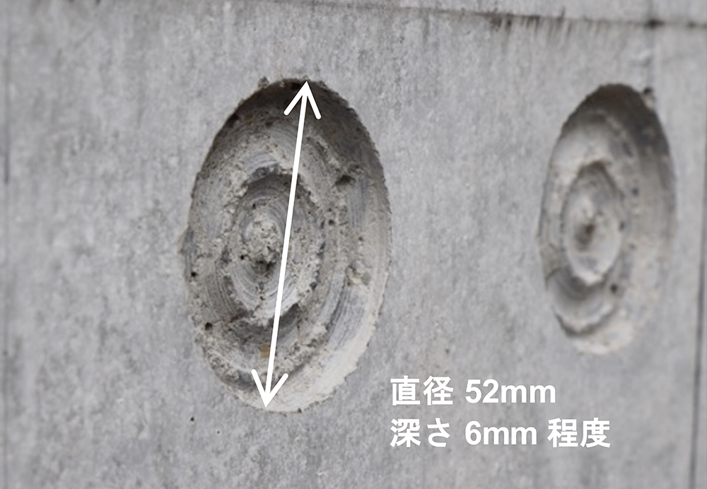 ブラストキー工法は、ブラストビットと呼ばれる直径52mmの専用のダイヤモンドコアドリルでコンクリート表面を切削するため、騒音、振動、粉塵を抑えて施工が可能である。ブラストキーの形状を写真❸に、使用する工具を写真❹に示す。使用するコアドリルには、所定の深さ約6mmとなるように、ブラストダンパーと称する専用治具が取り付けられている。施工は、施工面にコアドリルを押し付けて切削を行う。また、1カ所当たりの施工時間は、概ね40~60秒である。本工法を適用できる施工箇所は、建築構造物のコンクリート同士の接合面であり、既存建物との接合、改修や新築時の施工などの違いによらず適用可能である。また、耐震補強の接合面にあと施工アンカーと併用してブラストキーを適用する場合、ブラストキーがせん断耐力を負担することで、あと施工アンカー数量を最大20%低減できるメリットがある。なお、施工完了後は、ブラストキーの全施工数量の5%にあたる数量について、深さと形状の確認および施工数量の確認を行う。