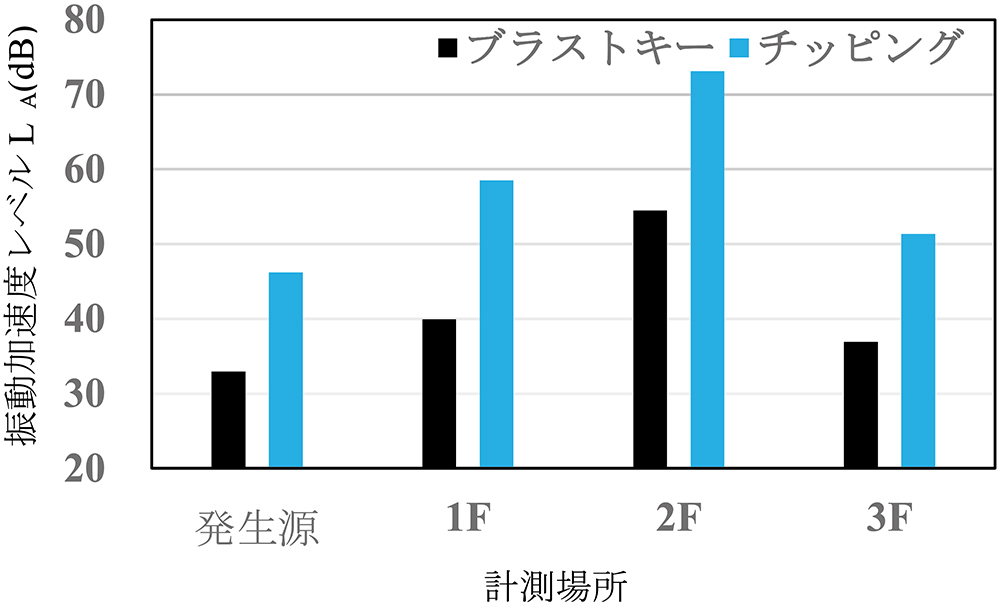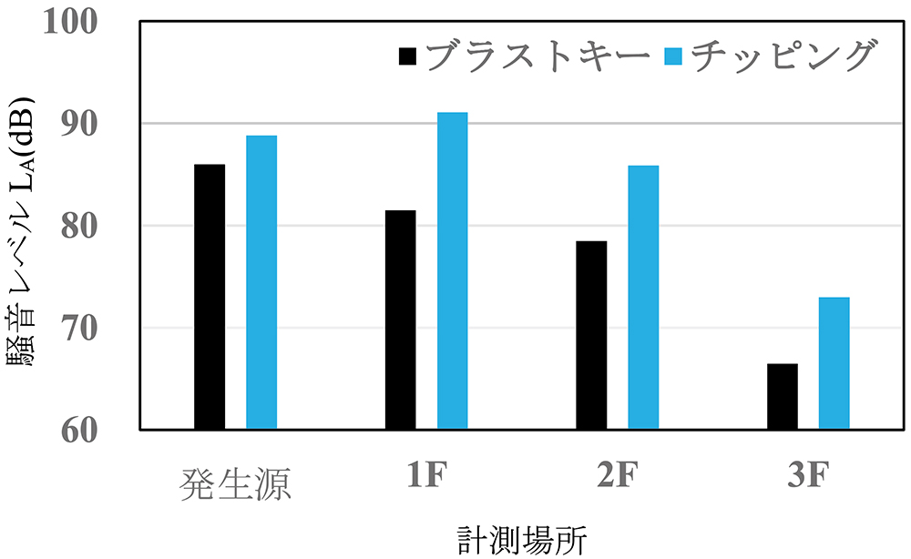 はじめに騒音レベル測定結果を図②に示す。騒音の評価量として、音の大きさを周波数ごとに感覚補正した騒音レベルを採用した。いずれの工法でも、施工中の騒音計の指示値は周期的に変動し、かつ指示値の最大値がおおむね一定であったため、その変動ごとの最大値の平均値を評価量とした。ブラストキー工法とチッピング工法を比較すると、すべての計測位置で騒音レベルはチッピング工法のほうが大きかった。また、その差は発生源に比べて1F、2F、3Fの方が大きかった。これは、施工個所から空気中を伝わる空気伝搬音よりも、壁や床、天井を伝わる固体伝搬音の影響が大きいためと考えられる。