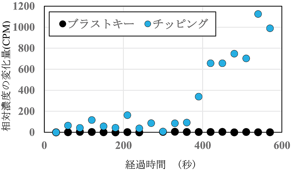 最後に粉塵計測について述べる。粉塵について、両工法の施工による粉塵発生量を比較することを目的として、相対濃度(CPM)を評価量とした。施工中の粉塵濃度の変化量を図④に示す。ブラストキー工法の場合、粉塵濃度の変化はほぼゼロであり、施工によって粉塵が発生しなかったことが確認できる。チッピングの場合、施工開始直後から粉塵濃度は変動し、約300秒経過してから急激に増加したことがわかる。