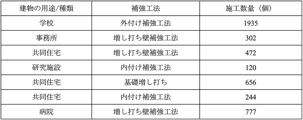 ブラストキー工法の施工実績一覧を表①に、学校の耐震補強工事にブラストキーを適用した事例を写真❺に示す。学校においては、授業中の施工であったが騒音、振動により授業を妨げることなく施工を行うことができた。また共同住宅における施工では、居住者への施工時の騒音、振動を抑えたことに加え、洗濯物等への粉塵が付着しないように配慮した。事務所に関しては、環境計測結果からもわかるように、1階で施工したチッピングは3階の執務室まで固体伝搬音による騒音が生じたが、ブラストキーは3階の執務室で仕事を行っていた方から、「ブラストキーを施工していた騒音には気付かなかった」とのコメントをいただいた。これらからブラストキーは、チッピングと比較して騒音、振動、粉塵を抑制できるため、使いながらの耐震補強に対して有用であることがわかる。まとめ