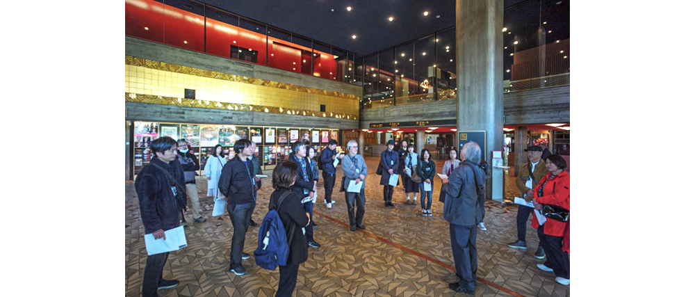 初めは集合場所にしていた前川國男の代表作、東京文化会館。先生曰く、丹下健三の「代々木屋内競技場」(1964年)と並び日本近代建築の金字塔であると熱く語られた。特にRC造の大庇が素晴らしく、その曲線美は女性の下唇をイメージした形状だと前川國男から聞いたとおっしゃっていた。また、パブリックなスペースには壁をつくらず自由に通り抜けできるような空間であることが重要ともいわれ、大小ホールのホワイエの配置にも見られるとのこと。床の磁器タイルの模様は落葉を連想したもので、目地割りに新人所員が1年間をかけたとも。まさしくわが国の代表的な音楽ホールの殿堂にふさわしい。