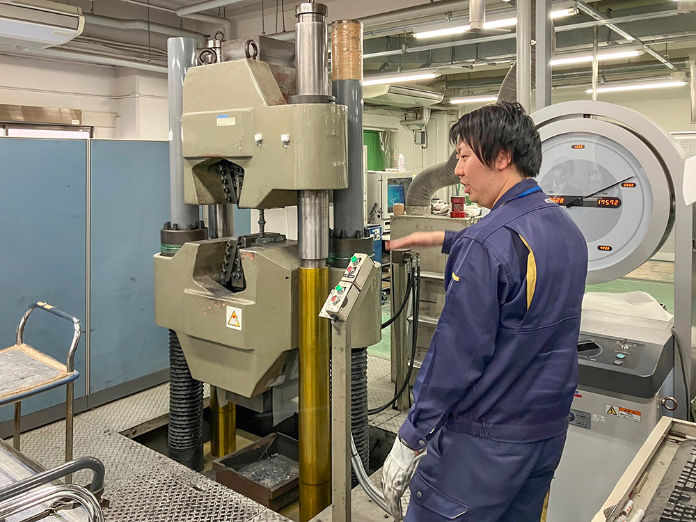 棒鋼の引張試験風景。