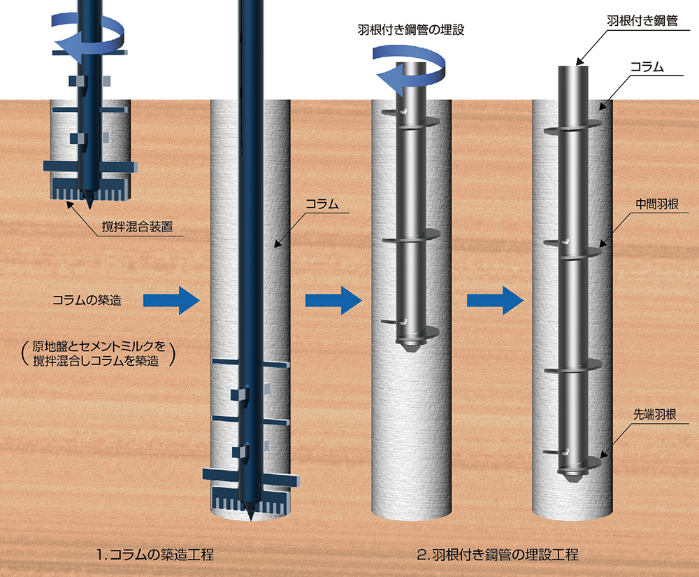 ATTコラム工法:羽根付き鋼管杭×柱状改良のハイブリッド工法