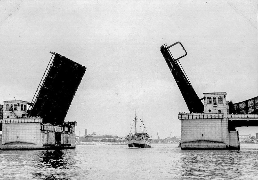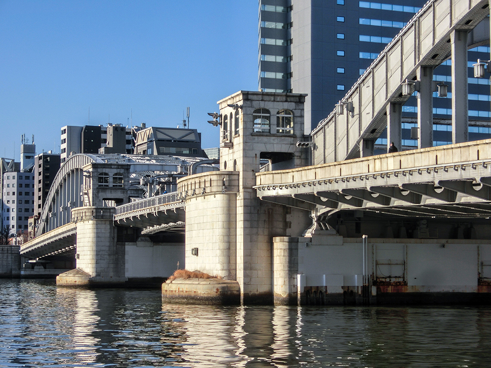 東京を代表する橋と問えば、「日本橋」や「二重橋」などと並んで隅田川に架かる「勝鬨橋」(❶)を挙げる人も多いであろう。勝鬨橋を有名にしたのは、橋の中央部分が「ハの字」に開く可動橋(❷)であったからで、1970(昭和45)年11月に桁の可動を終えるまでは、多い時は日に5回(定時、予約制)開橋していた。特に昭和20~30年代は、隅田川の舟運が盛んだったために開橋が頻繁に行われ、東京を代表する観光スポットとして多くの見物客で賑わった。初代ゴジラは東京湾から上陸後、最初に破壊したのが「勝鬨橋」であったが、このことからも東京をイメージし代表する建造物であったことが伺える。「勝鬨橋」は1940(昭和15)年に開通し、東洋最大の可動橋と謳われた。橋の構造は、橋長246m、幅員22mの3径間の鋼橋で、主径間は51.6mのシカゴ型双葉式跳開橋、両側の側径間は86mのタイドアーチ橋から成る(❸)。シカゴ型というのは、米国のシカゴ市に多く架設されたことから日本国内で付けられた呼称で、トラニオン式バスキュール型可動橋(trunnion bascule bridge)が正式名称である。東京では、日本の可動橋王と呼ばれた山本卯太郎が設計した、「常磐線隅田川駅構内運河跳上橋」(1926/大正15年、❹)と「芝浦跳開橋」(1929/昭和4年、❺)に次ぐ3橋目の可動橋であった。