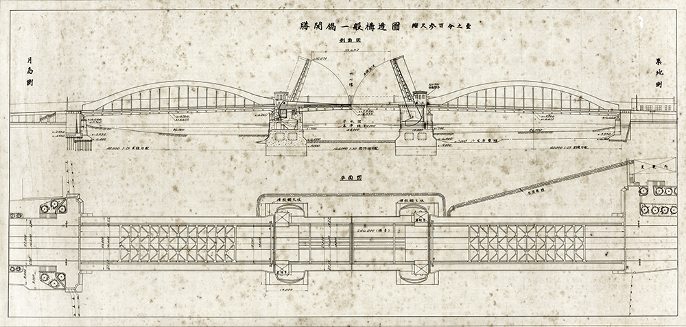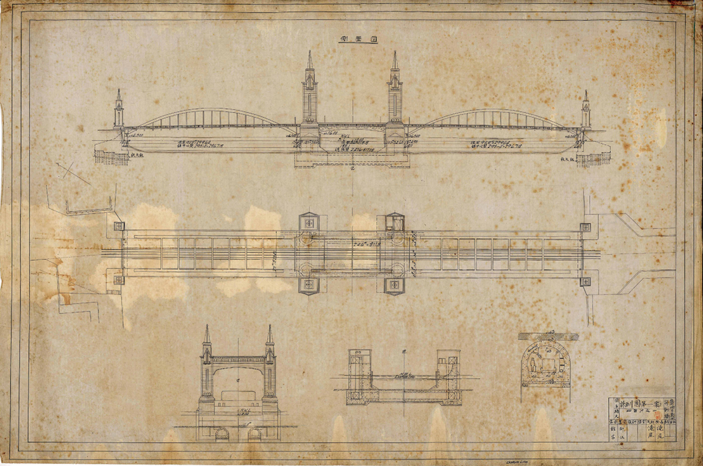 現在、「勝鬨橋」については、現橋の図面(❸)以外に4枚の計画案が東京都に残されている。うち2枚は、図面の作成日から岡部在職時に書かれたものと推察される。(1)計画図第一案