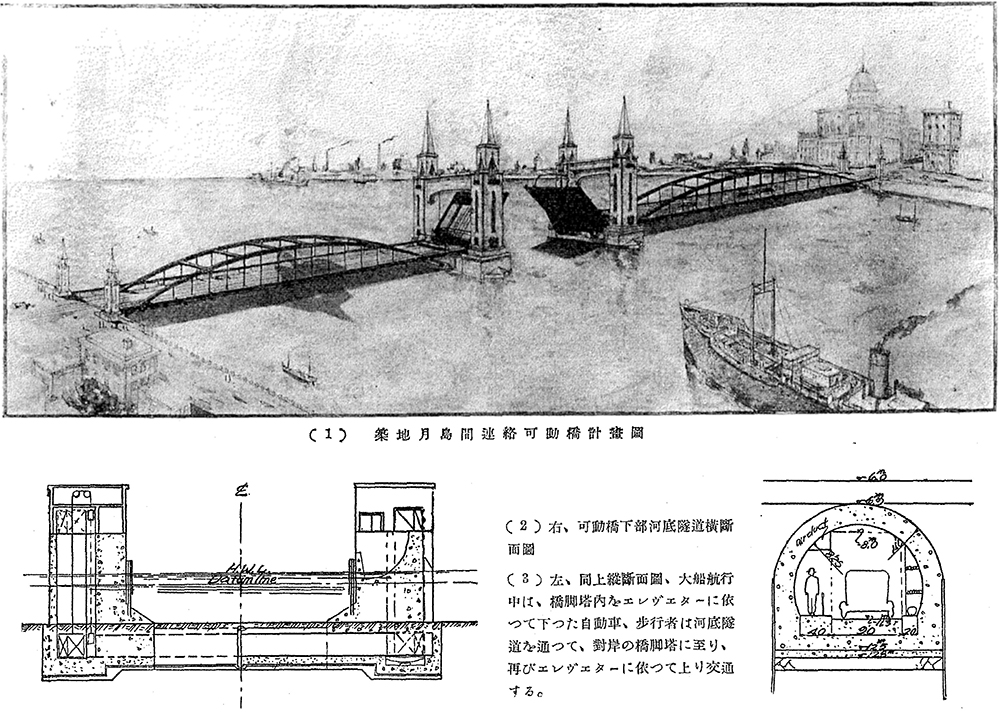 明治中期以降、隅田川河口周辺では、浚渫して喫水を確保するとともに、浚渫土砂で埋め立て地を造成しふ頭などを整備する東京港の近代化が図られた。これにより、1892(明治25)年に月島が誕生し、引き続き、大正にかけて勝どきの埋め立てが行われた。1903(明治36)年には「相生橋」が架設され、清澄通りが延伸されて市街地と繋がったが、市街化が進んで交通需要が増し、明治末には隅田川に新たな橋梁の架設が求められるようになった。1910(明治43)年11月24日の『読売新聞』には、東京市が架橋調査を行っている旨が書かれ、架橋位置については「築地本願寺側から一直線に月島へ架橋し……」、橋の構造については「船舶の航行に支障なからしむるため開閉橋とならざる……」と記されている。これから、架橋位置は概ね現在地で、構造は当初から可動橋を想定していたことがわかる。