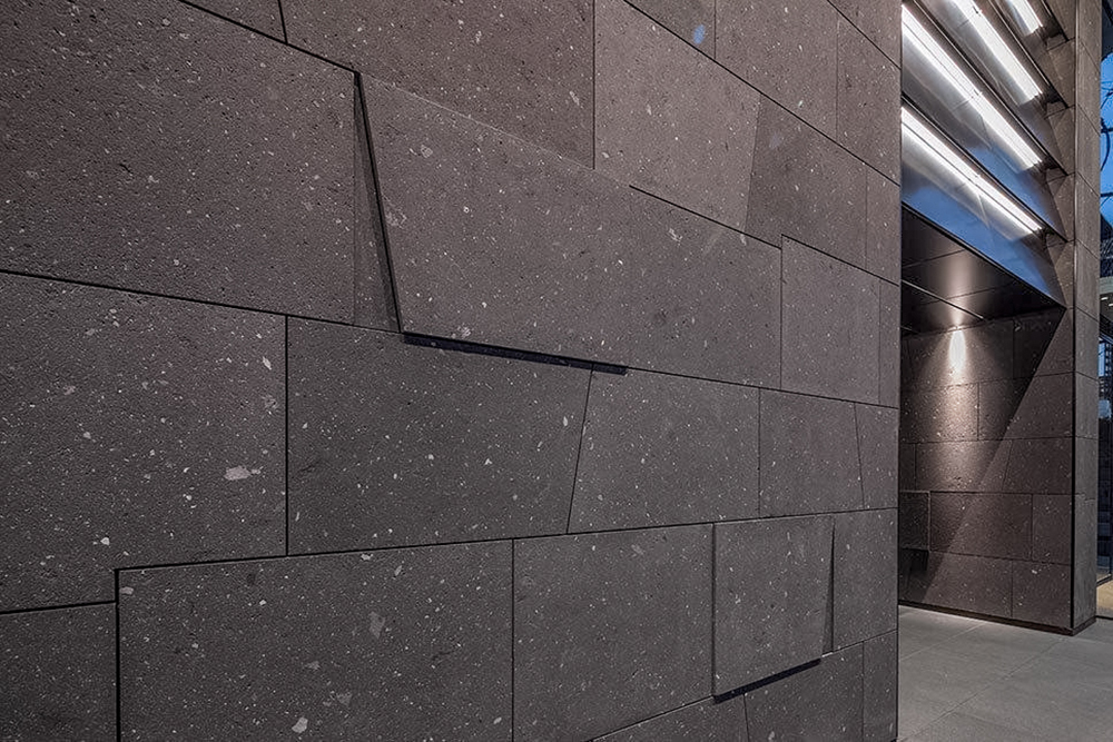 阿蘇の大地から生まれた石「肥後石」。阿蘇山の噴火により形成された溶結凝灰岩で、落ち着きのあるダークブラウンの石肌が温かみと味わいを醸し出し、石面に浮き出る白い鉱物の断面が印象的な模様をつくり出します。石質は適度な硬さをもちながら、軽く、加工しやすいことから、内外装の床の石張りのほか、壁面の仕上げ材、造作カウンターなどに使っても、空間によくなじみ、シックな美しさを呈します。表面仕上げでは、「切削」、「サンドブラスト」、「スクラッチライン」が、この石の美しさをひときわ引き立たせてくれます。