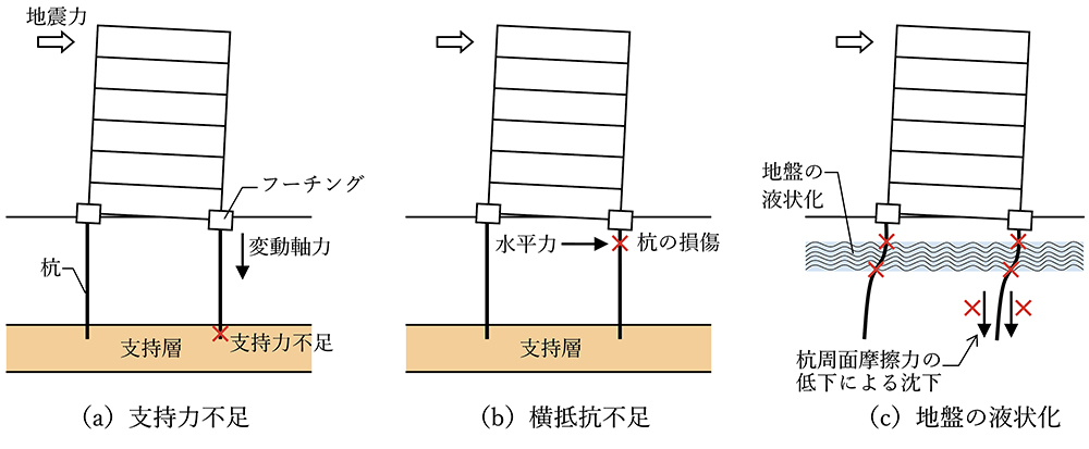 令和6(2024)年1月1日に発生した能登半島地震において、輪島市に建っていた7階建てのRC造建物が倒壊した。被害原因は現在調査中であるが、昭和48(1973)年に建設された杭基礎のこの建物は地面にめり込む状態で倒壊し、隣接の3階建て木造家屋を押し崩し、2名の人命が失われた。基礎・地盤による建物の被害は、昭和39(1964)年新潟地震において地盤の液状化により複数の建物が倒壊した被害や、地中の杭が損傷して建物が沈下し、傾くなどの被害が報告されているが、非木造建物の倒壊により人命が失われることは国内では初めてであった。杭基礎の被害要因には、図❶に示す地震時の変動軸力に対する支持能力不足、地震時の水平力に対する横抵抗不足、地盤の液状化に伴う杭の支持能力と横抵抗力の著しい低下が考えられる。今回倒壊した建物が軟弱地盤上に建つ杭基礎の建物であることから、首都圏で直下型地震が発生した場合、軟弱地盤に建つ建物に甚大な被害が発生することを懸念する報道があった。しかしながら、東京都では安全なまちづくりを旧来から目指しており、東京都建築士事務所協会が発行し東京都建築構造行政連絡会監修の建築構造設計指針に基づき安全性が高い設計を行うことが推奨されてきた。この指針の内容は社会に十分に伝わっていないようであるため、諸先輩から受け継いできた東京の耐震安全性確保のためのこの指針の要点などを含めて以下に紹介する。