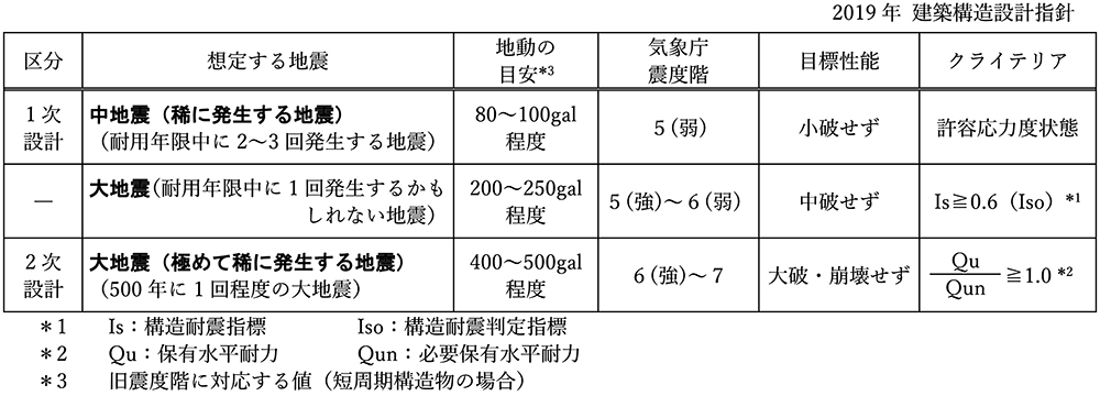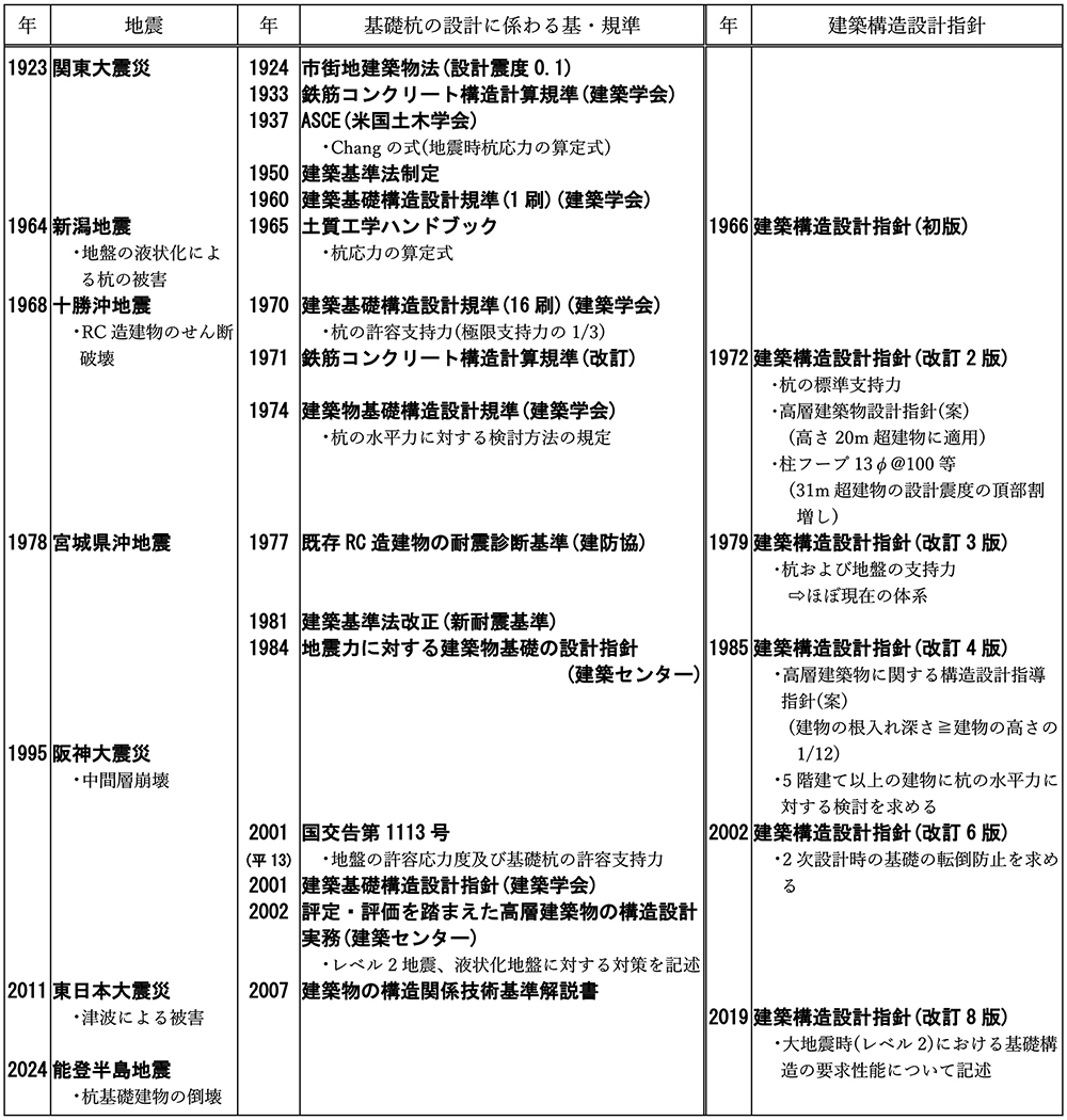 昭和43(1968)年十勝沖地震における建物の被災を踏まえ、昭和52(1977)年には既存建築物の耐震診断基準が日本建築防災協会から発刊され、昭和56(1981)年には建築基準法が新耐震基準に改正された。これ以降の建物には表④、表⑤に示すように震度5弱の地震動に対し目標性能を小破せずとし、クライテリアを短期許容応力状態、震度6強~7の地震動に対して目標性能を大破・崩壊せずとし、クライテリアを保有水平耐力以下とする2段階の地震に対する耐震設計が求められることとなった。しかしながら、建物基礎についての耐震設計上の法整備は上部構造に比較して遅く、昭和59(1984)年に『地震力に対する建築物基礎の設計指針』、平成13(2001)年に国土交通省告示第1113号において地盤の許容応力度および杭基礎の許容応力度が定められたが、2次設計に対するクライテリアは定められていない。