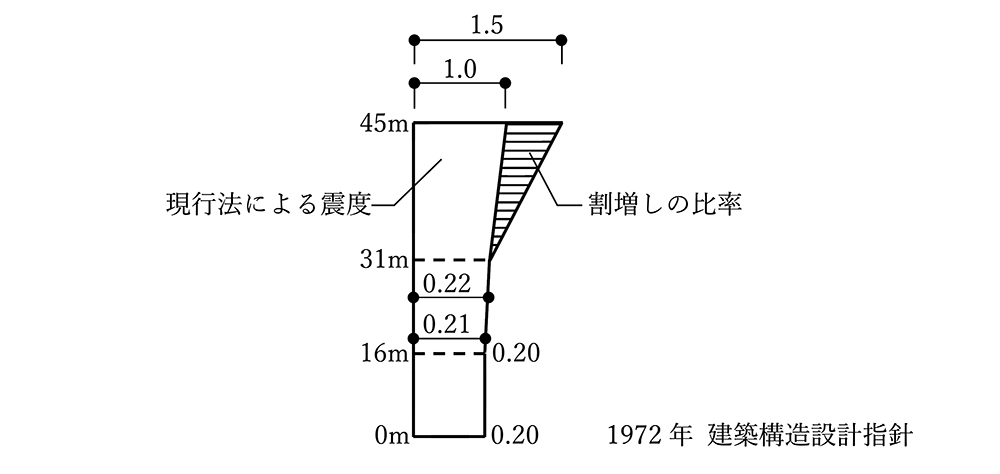 建築物基礎および基礎杭の旧来の耐震設計方法については、上部構造と異なりその実態が十分には把握されていない。建物・基礎杭の設計に係る基規準の変遷を表①中央欄に、『建築構造設計指針』の変遷を表①右欄にまとめる。関東大震災の翌年である大正13(1924)年に市街地建築物法に建物の設計震度が規定され、上部構造の耐震設計はこの時期に開始されたといえる。地中深く打ち込まれた杭に水平力が作用する場合の応力計算式(changの式)が昭和12(1937)年に米国土木学会で発表され、地震力に対する杭の設計も旧くから行われていた可能性はあるものの、その実態は把握されていない。昭和8(1933)年には『鉄筋コンクリート構造(RC)計算規準』が、昭和25(1950)年には建築基準法が、昭和35(1960)年には『建築基礎構造設計規準』(以下、基礎規準)が制定され、建物および基礎の設計方法はこの時期に確立されたといえる。杭については昭和45(1970)年版基礎規準において許容支持力が極限支持力の1/3と規定されており、昭和49(1974)年版基礎規準において杭の水平力に対する検討方法が記述されている。一方、東京都では昭和41(1966)年に『建築構造設計指針』が発刊され、この指針は建築技術の進歩に応じた都市の立体化と高層化の傾向に対応し、構造耐力上の安全性を確保するためとしている。昭和47(1972)年改定2版では、高さ20m超の建物の柱帯筋に13φ@100を求め、高さ31m超の部分の設計震度を図❷に示すように1.5倍に割増すなど、中高層建物の耐震性能の確保が図られた。また杭基礎については、N値50以上の良好な地盤に支持させることを条件に、既製コンクリートパイルについて表②の標準支持力を示すなど、杭支持力の確保に寄与してきた。さらに、昭和54(1979)年改訂第3版では、杭の支持力算定において液状化の恐れがある地盤の周辺摩擦力をみないこと、場所打ち杭では表③に示す値を長期支持力の上限とし、杭の先端を良質な地盤に1.0mかつ杭径以上貫入することを求めている。