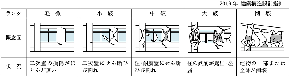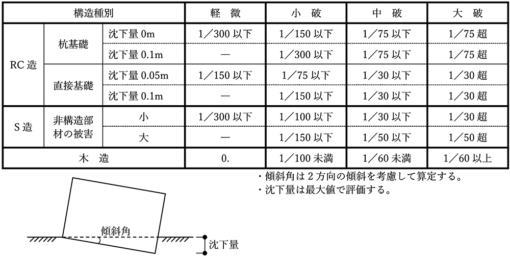 東京都内の地域は平成23(2011)年東日本大震災において震度5(弱)~震度5(強)の揺れを経験している。表④および表⑦を照らし合わせると、震度5(弱)の地域では建物に「軽微」の被害、震度5(強)の地域では建物に「小破」の被害、震度5(弱)の地域では建物基礎に「1/300以下」の傾斜、震度5(強)の地域では建物基礎に「1/150以下」の傾斜を受ける可能性があったといえる。しかしながら、この13年間における非木造建物を対象とした耐震診断結果の審査において、建物および基礎について上記の被害は報告されていない。