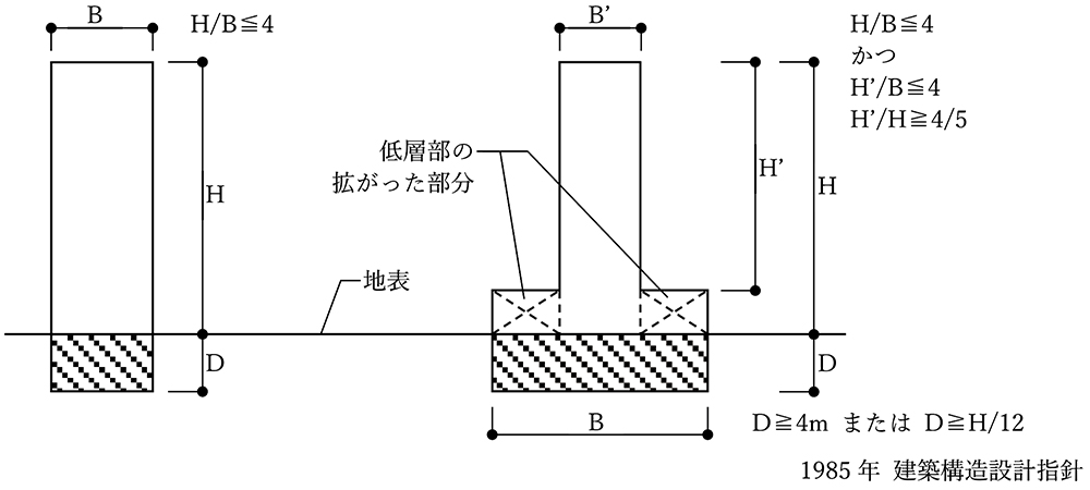 一方、昭和60(1985)年『建築構造設計指針』(改訂4版)では、5階建て以上の建物に杭の水平力に対する検討を求めるとともに、高さが20mを超え60m以下の建物を対象に高層建築物に関する構造設計指針(案)が策定され、図❸に示す建物の地盤への根入れ深さなどが規定され、中高層建物の耐震性能の確保が図られてきた。