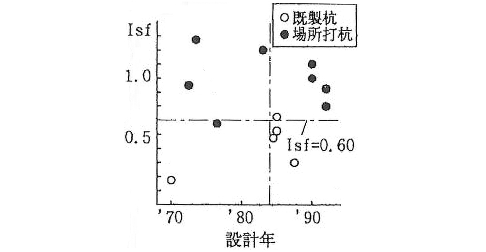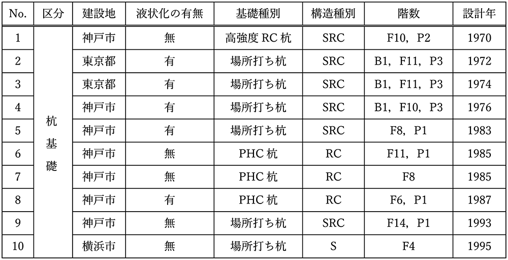 阪神大震災では、基礎の被災により建物に構造上、機能上の被害を受けた事例が多く見られたことから、文献2)では上部構造の構造耐震指標(Is)と同様に建物の基礎についても耐震性能を基礎の耐震指標(Isf)に評価することを提案し、杭基礎、直接基礎の建物21棟について基礎の耐震性能を検討している。ここでは表⑥に示す杭基礎の建物10棟の基礎の耐震性能(Isf)を(1)式により算定した検討結果について紹介する。