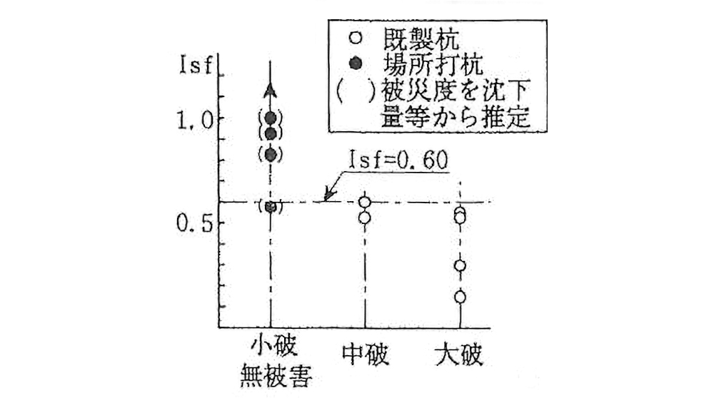 ①杭基礎では、基礎の耐震性能Isfが0.60以上の建物では小破を超える被害が生じていない。(図❹)
