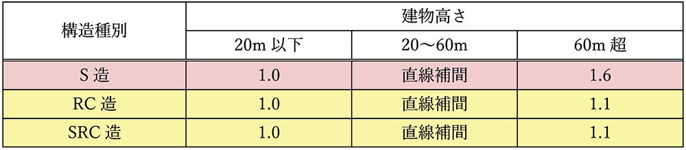 最新版の『建築構造設計指針2019』は、1章~10章を東京都建築士事務所協会構造技術専門委員会で執筆し、11章~12章を東京都建築構造行政連絡会が執筆している。第1章では建物に求められる性能を記述しており、現行法の耐震設計基準では一次設計に用いる地震動が建物の高さに応じて増大する傾向があるものの、図❼に示すように中高層(高さ20m~60m)の建物では設計用地震力が連続的に増大していないため、設計用地震力の割増しが必要であることを指摘している。この割増しの必要な程度を把握するため、地震応答解析に基づく耐震設計が行われた高層評定で採用された1次設計用の地震力(ベースシアー係数)と、現行法による1次設計用地震力(ベースシアー係数)を図❽において比較している。図中の赤線は鉄骨造(S造)の高層評定で採用された地震力、緑の点線はS造建物(建物周期=0.03H(高さ))に求められる地震力であり、両者の比は1.56となる。図中の黄色の曲線は鉄筋コンクリート造(RC造)の高層評定で採用された地震力、青の点線はRC造建物(建物周期=0.02H)に求められる地震力であり、両者の比は0.94となる。東京のように中高層建物が密集している地域において建物に付与すべき耐震性能は、建物が被災した場合に社会に与える影響度の大きさに応じて設定する必要があるとし、目標性能の目安を建物の高さに応じて表⑧に示すように、高さ20m以下では大破・倒壊せず、高さ20~55mでは高さに応じて設定、高さ55m超では中破せず、としている。これらを踏まえ、密集市街地の建物に求める保有水平耐力を表⑨に示すように、地震時の変形が大きいS造では高さ20m以下では割増しは不要、20〜60mでは1.0~1.6倍、60m超では1.6倍するなど、割増すことを推奨している。