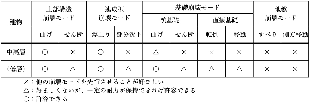 「第10章 基礎構造」では常時、中地震時、大地震時において基礎に求める性能の一例として、沈下、移動、傾斜に区分し、表⑩に示す中地震に対しては継続使用に有害な変形を生じさせない、大地震時には安全性に影響する変形を生じさせないこと、などを求めている。また、中高層建物においては基礎の被害は人命に影響する大きな災害につながる可能性があり、建物重量が大きいため基礎の被害の修復は困難であることから、好ましくない破壊モードを表⑪に×印で示し、中高層建物における基礎の被害の抑制を求めている。