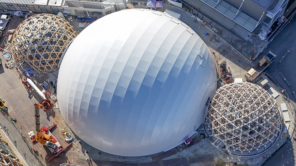 左から、竹集成材のドーム(膜施工前)、CFRPドーム(膜施工済)、紙管ドーム(膜施工前)。
