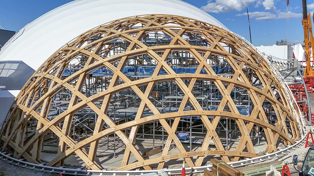 CFRPのドームには最上層にスチールが使われ、その内側に100φのCFRPを独自開発の接合部材で継ぎ、2層を特注のスペーサーを介して紐で結んで実現した。