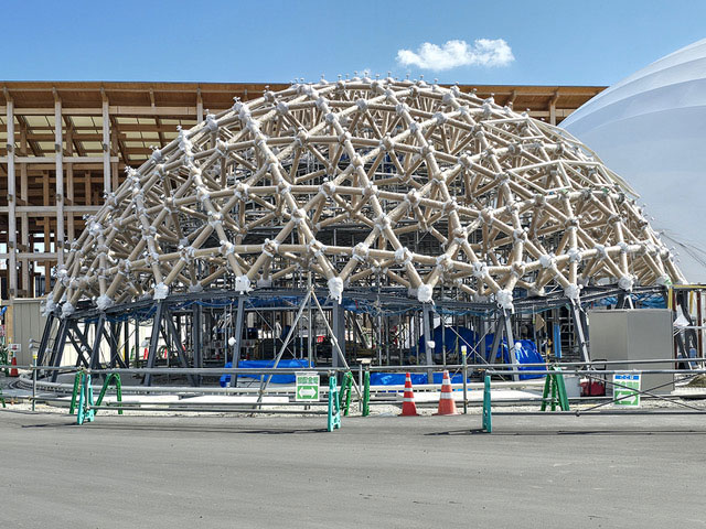 素人には、竹もカーボンファイバーも曲がる(しなる)イメージである。しかし…。まずは素材そのものについて、さまざまな試験を行い、それを考慮した形状や構成や接合部を検討し、そしてやっとの思いでつくった部品や接合部を再度、試験や実験を行い、修正を加えていく。実験方法そのもの、場合によってはテスト治具や製造するための治具も、そしてでき上がった部材の検査方法までも自前で考えなければならなかった。素材・部材ひとつひとつにこれらの苦労話が続く。それだけではない、一例だが、紙管の接合部(ノード)に採用した500個の木球(300φ)は、この形状から材料の決定までの実験も大変だったのだが、その上で建築家(坂先生)の意向で、仕上げに紙やすりでひとつひとつ手で「つるつる」になるまで磨いたそうである(木球は実際には9mもの先の天井にある)。紙管のドームでは、鉄骨を紙管に入れ紙管を座屈補鋼部材として使う案を提案し、先ほどの木球でつなぎ三角形と六角形で構成するフラードームを実現した。