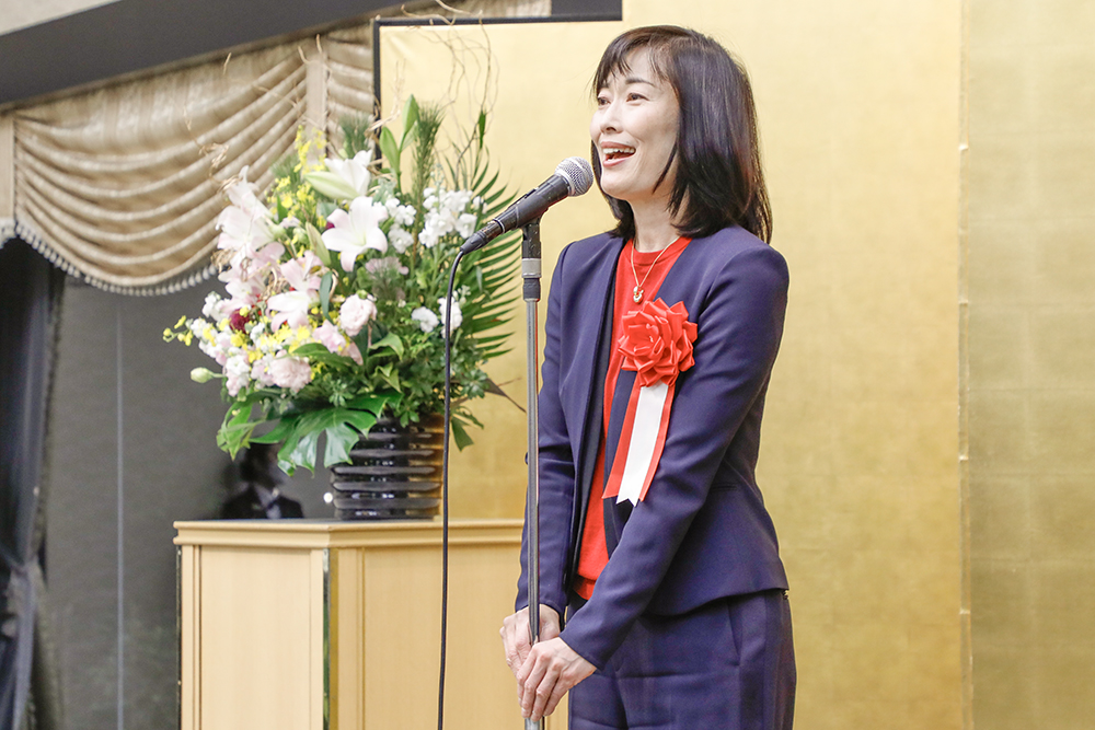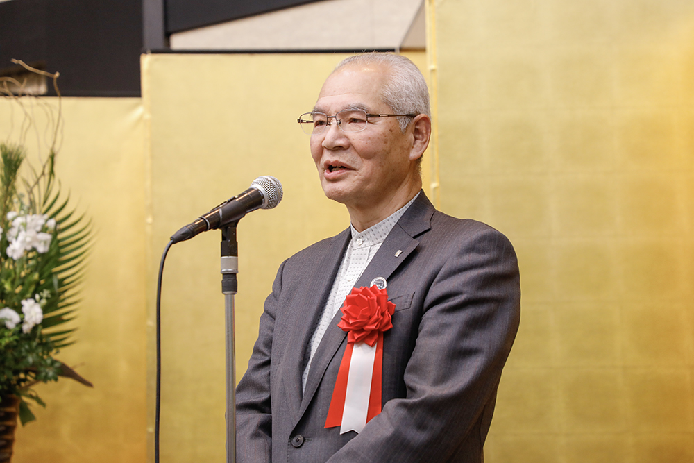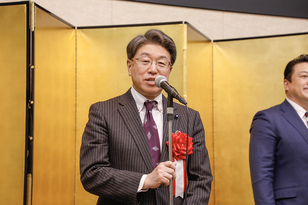 明治記念館「蓬莱の間」にて新春賀詞交歓会が開催された。富樫亮副会長の開会の辞が述べられ、正副会長が登壇し会長の挨拶となった。