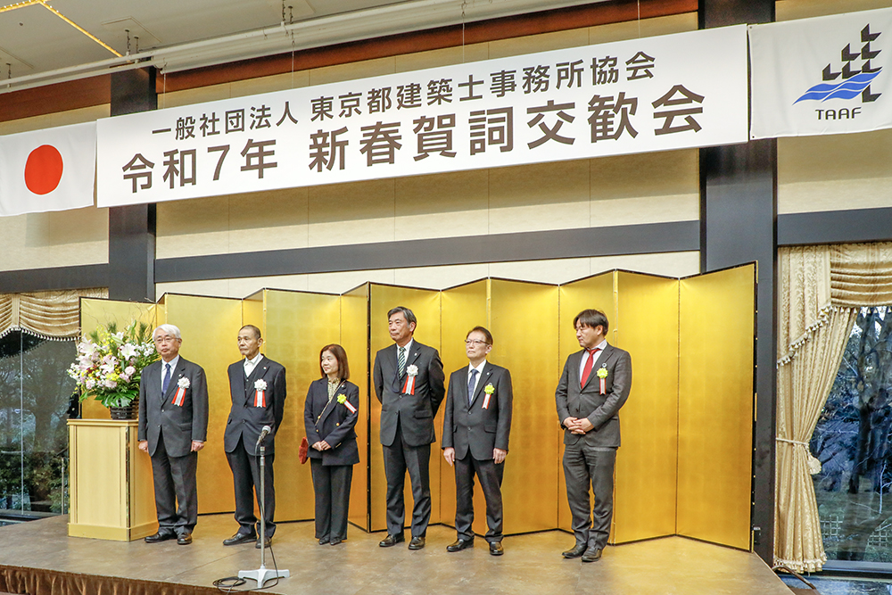 新春賀詞交歓会(2025年1月29日@明治記念館)での表彰式。壇上には表彰対象の会員事務所と支部代表。(撮影:大平孝至)