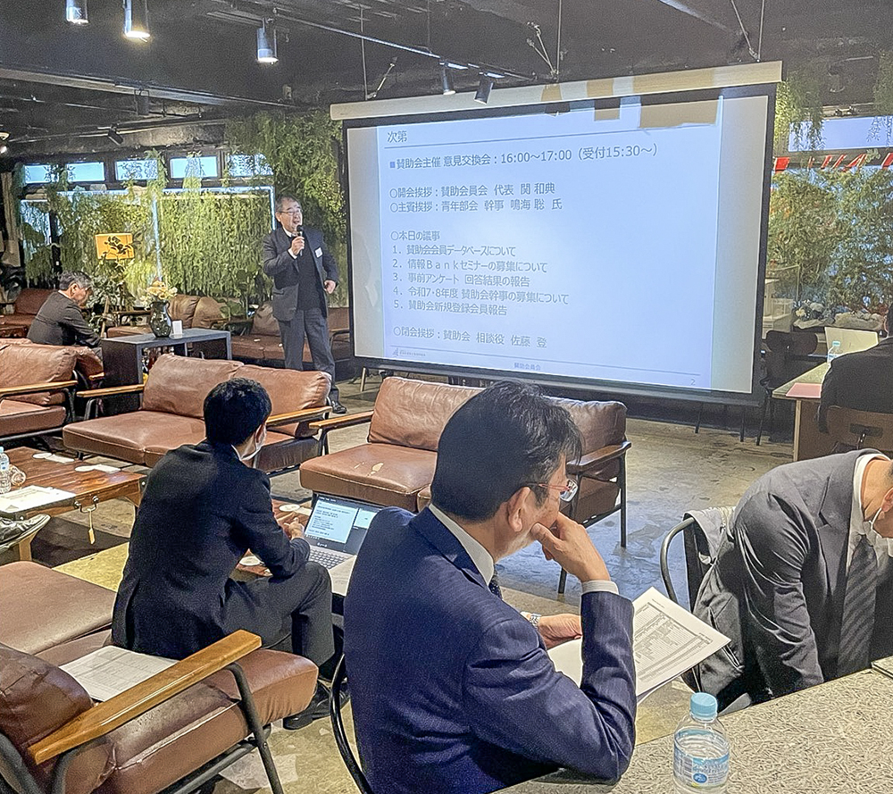 初めに関和典賛助会代表より開会挨拶があり、続いて来賓挨拶を青年部会幹事鳴海聡様よりいただいた。続いて各賛助会幹事が紹介され、今年度の活動報告が行われた。