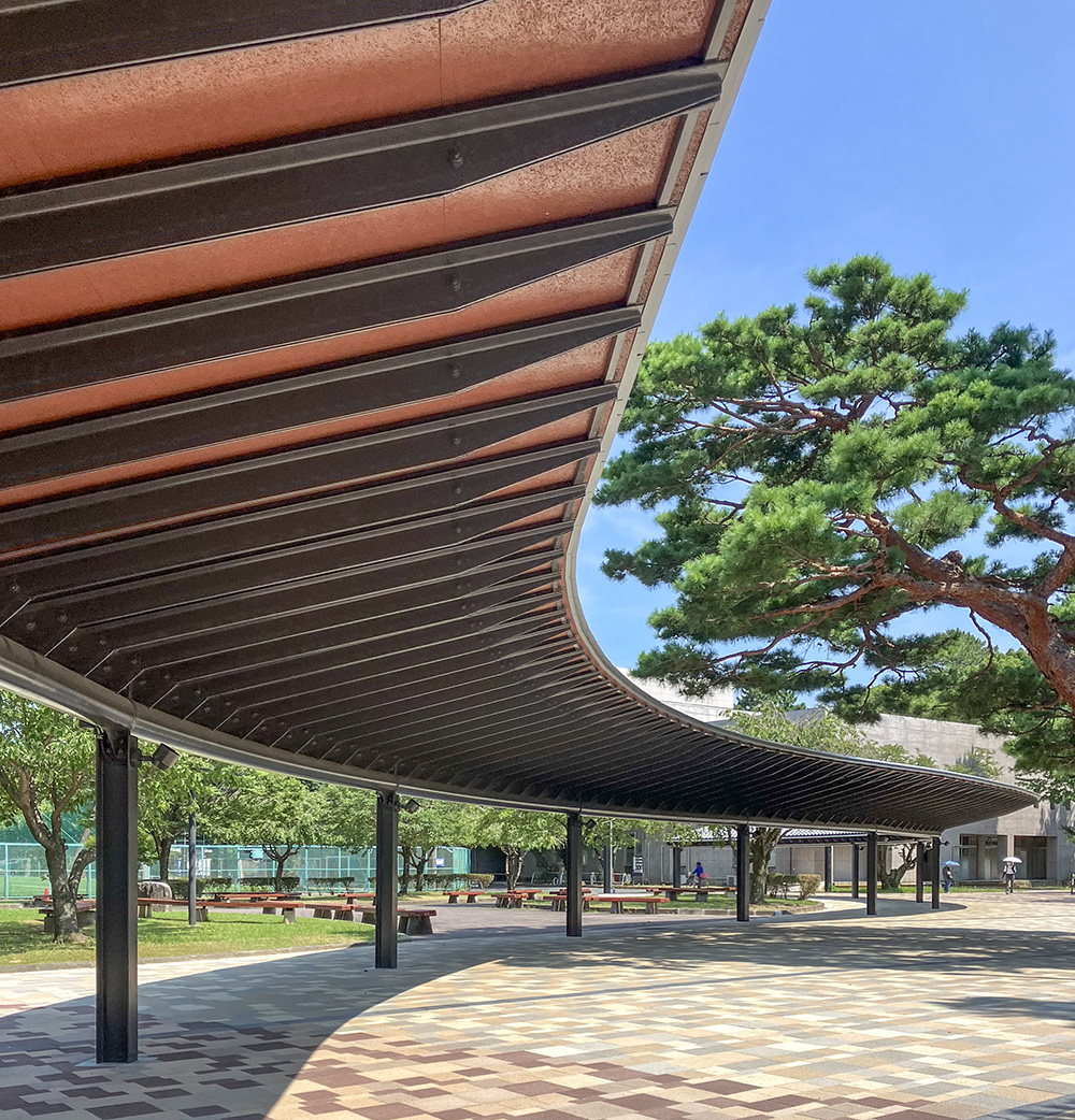 今回は中部地方で採用された大学案件2件のご紹介です。ひとつは特徴的な格子状のファサードの裏の鉄骨。鉄骨ファブも苦労した複雑な形状に対する長期防錆目的でご採用いただいています。もうひとつは食堂と図書館を見事な曲線で繋いだ通路の片持ち庇にご採用いただきました。環境にマッチした上塗りが施されています。