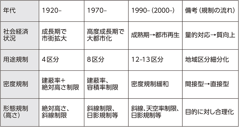 この時代の密度規制は、用途規制をベースに、建蔽率制限と高さ制限とを組み合わせ、間接的に行われた。建築規制の適用においては、事業活動の広域化や都市整備の迅速化が求められ、市街地建築物法が施行され、全国統一的な対応(基準の標準化、仕様書方式での規定)となり、全国的に広く事業を展開する者にとっては建設活動がスムーズとなった。なお、市街地建築物法の成立以前は、各地方ごとに条令によって建築規制が行われていた。