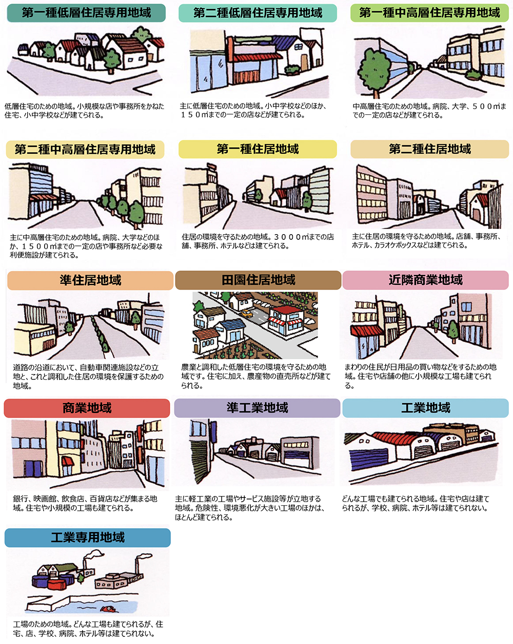 そこでわが国では大正・昭和の経済成長・都市拡大期にはゾーニング方式、そして社会が落ち着き経済も安定化してくると詳細計画方式を導入、近年は都市の安定・成熟化に伴い、この手法の活用区域が次第に広がってきている。今日のわが国はゾーニング方式(用途地域等)をベースに、必要に応じこれに詳細計画方式(地区計画等)を重ねる方法で、建物用途が規制されている。ここでは、近代建築法制において建物用途規制のベースとなるゾーニング手法を取り上げ、基本的なゾーニングとしての「用途地域」、そしてこれを補完するその他の用途にかかるゾーニングについて紹介する。なお、詳細計画手法については、地区計画の項で別途取り上げることとする。