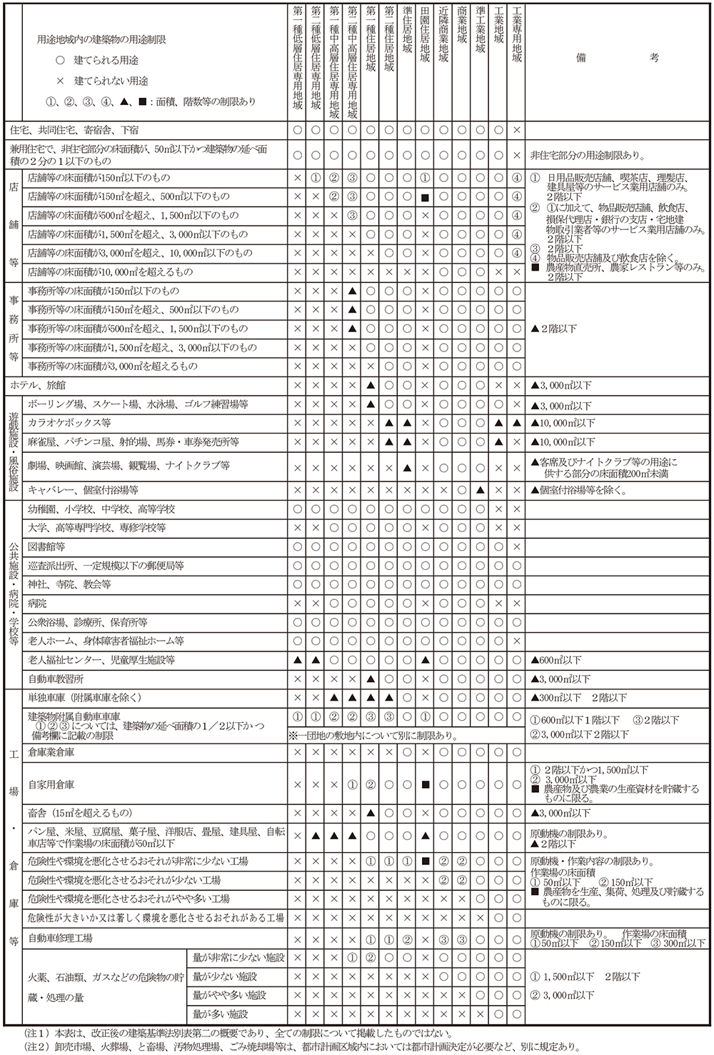 「店舗」については、住宅地等における商業サービスのための施設として、基本的には需給関係に基づいて、住宅周りに配置されるものであるが、商業サービスの利便性より住環境の維持が優先される低層低密度の住宅地(低層住居専用地域および田園住居地域)においては、地域の生活環境を守る意味から、地域コミュニティにおける生活の維持に必要な店舗のみの立地を認め、地域コミュニティに関係しない、外部の不特定多数の人びとをサービス対象とする規模・形態を有する店舗の建築を基本的に禁止している。また、工業専用地域においては、やはり地域の外部に存する不特定多数の人びとをサービス対象とする、物品販売店舗と飲食店について建築を禁止している。