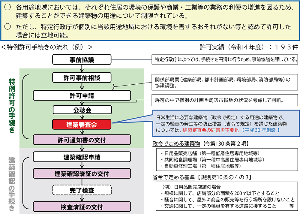 【用途の許可】用途地域制度の導入当初は、公衆衛生(煙害、騒音・振動、悪臭など)面を中心に、生活環境の保護を図るとともに、工場等の市街への集積に伴う住工混在問題の発生抑制を中心に、異種用途の混在を大きく規制してきた。この趣旨から、用途の許可にあたっては、地域環境が悪化しないかどうか、周辺住民の受容性も含め確認するとともに、土地利用計画などに定める目標・方針に照らし、公益性があるかどうかも見極めて対応している。