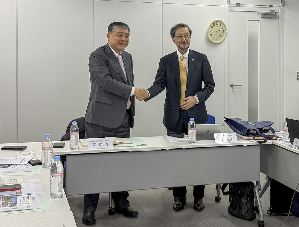 握手を交わす葉松青上海勘察設計行業協会副会長と、千鳥義典東京都建築士事務所協会会長。