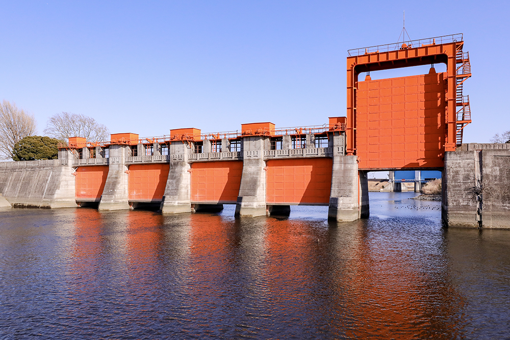 地盤の軟弱な赤水門建設は難工事であった。水門の基礎は川底から約20m掘り下げられ、6本の堰柱によって強固な構造となっている。工事中の大正12(1923)年の関東大震災の際にも無傷であったことから、その技術力の高さが伺える。